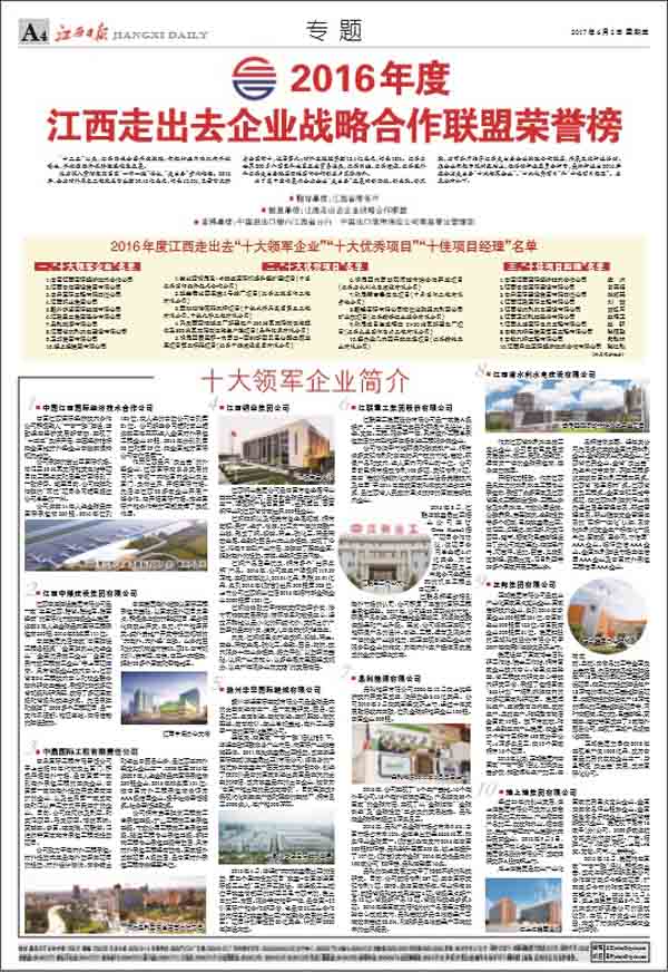 6月3日,江西走出去企業(yè)戰(zhàn)略合作聯(lián)盟2017年大會(huì)在南昌召開(kāi)。省委常委、常務(wù)副省長(zhǎng)毛偉明出席大會(huì)并作重要講話,會(huì)上省委常委、常務(wù)副省長(zhǎng)毛偉明、省政府秘書(shū)長(zhǎng)王亞聯(lián)和省商務(wù)廳廳長(zhǎng)王水平分別為2016年度全省走出去“十大領(lǐng)軍企業(yè)”、“十大優(yōu)秀項(xiàng)目”和“十佳項(xiàng)目經(jīng)理”授牌。江西走出去企業(yè)戰(zhàn)略合作聯(lián)盟輪值主席、中國(guó)江西國(guó)際經(jīng)濟(jì)技術(shù)合作公司總經(jīng)理徐國(guó)建報(bào)告了2016年工作,國(guó)家開(kāi)發(fā)銀行江西分行、中國(guó)進(jìn)出口銀行江西省分行和中國(guó)出口信用保險(xiǎn)公司南昌營(yíng)管部作為聯(lián)盟副主席單位發(fā)言。公司董事長(zhǎng)王元旦作為十大優(yōu)秀項(xiàng)目的企業(yè)代表發(fā)言。《江西日?qǐng)?bào)》、《江西衛(wèi)視》相繼對(duì)大會(huì)進(jìn)行了大幅報(bào)道。