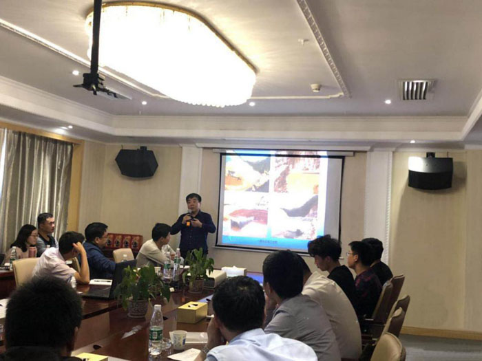現(xiàn)場參觀結束后,學習團參加了技術培訓和經(jīng)驗交流會。總經(jīng)理助理杜凌主持了開班儀式??偣こ處熀櫥汀㈨椖扛苯?jīng)理李成,對洋前壩水庫的大壩總布置、大壩施工導流、大壩及供水管道施工技術細節(jié)等,通過文字、圖片、視頻等組成的PPT課件為學員授課,并就學員提出的問題逐一進行了解答。