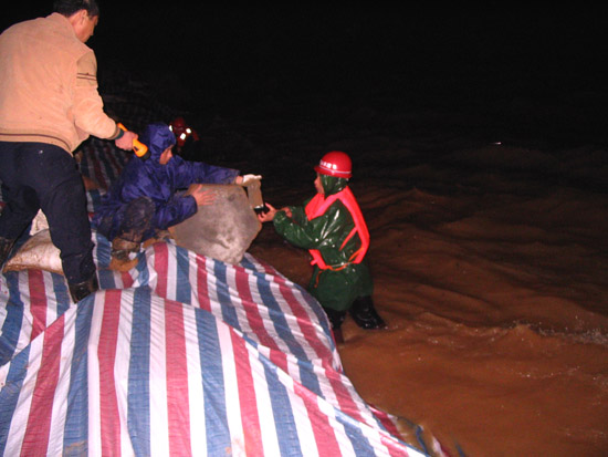 根據以往的施工經驗,我們很快啟動了搶險應急預案。但由于環境惡劣,考驗我們的時候到了,要發揚我們江西水建人“特別能吃苦、特別能戰斗、特別能忍耐、特別能協作精神”的時候到了,我們與洪水搶時間、爭進度,全體干群在漆黑的大堤上是一片穿梭奔跑的身影,大家齊心協力,手提肩扛,把一百多斤一塊的混凝土預制塊,一塊塊運到堤腳,此時項目部總工曾俊平不顧江水的寒冷,帶領其它幾名員工,奮身躍入水中,在水下鋪設彩條布,而此時水下溫度只有10℃左右,渾濁江水一浪高過一浪拍打在他們的身上。大家顧不上寒冷,顧不上疲勞,顧不上饑餓,衣服濕了又干,干了又濕,分不清是哪次被汗水還是雨水弄濕的,在微弱的手電光照亮下鋪設了一條又一條彩布條,碼起了一道又一道沙包小堤。經過大家的緊張奮戰,終于幾處險情得到了控制,等到我們在忙碌中回過神來時,已經是次日的凌晨三點多鐘,盡管大家拖著一副疲憊不堪的泥身子,但大家臉上裝滿了滿意和勝利的微笑,王總此時飽含真情地對大家說了一聲:“大家真的辛苦了,謝謝大家!”走在回家的路上,我正好與項目總工曾俊平走在一起,我看到他渾身濕漉漉的,我關心的問他在水中冷嗎?他笑笑說道:“這是關鍵時刻,再冷也要下”。他旁邊的同事告訴我,他是從下午三點鐘就一直在水里做事直到剛才,整整在水中浸泡了十二個小時。我們參加搶險的同志被曾俊平這種不怕困難、不畏艱險、不顧個人安危、敢于吃苦的精神深深感動著,真是我們學習的好榜樣!