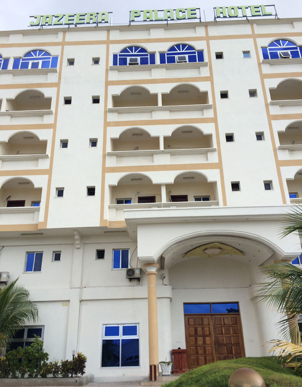 我們?nèi)胱〉氖前雿u皇宮酒店,也是中國(guó)駐索使館的臨時(shí)辦公產(chǎn)所。三道門的安全防護(hù)可謂警備森嚴(yán),戰(zhàn)爭(zhēng)國(guó)家的氣象從這可見一斑。酒店內(nèi)布置簡(jiǎn)單,但設(shè)施齊全,與酒店外充滿殺氣的氣氛不同,酒店內(nèi)人來(lái)人往,商人喝著咖啡悠閑地談著生意。我們也坐著邊喝咖啡邊商談工作計(jì)劃,不時(shí)有索馬里人來(lái)打招呼,用中文說(shuō)“你好”,并客氣地握手表示熱情歡迎來(lái)到摩加迪沙。
