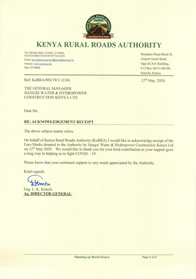 5月12日,江西水建肯尼亞分公司履行企業(yè)的社會責(zé)任,向肯尼亞鄉(xiāng)村公路局捐贈了10,000只防護口罩,用于支持其員工及員工所在社區(qū)的防疫工作。